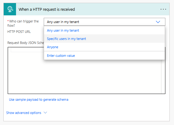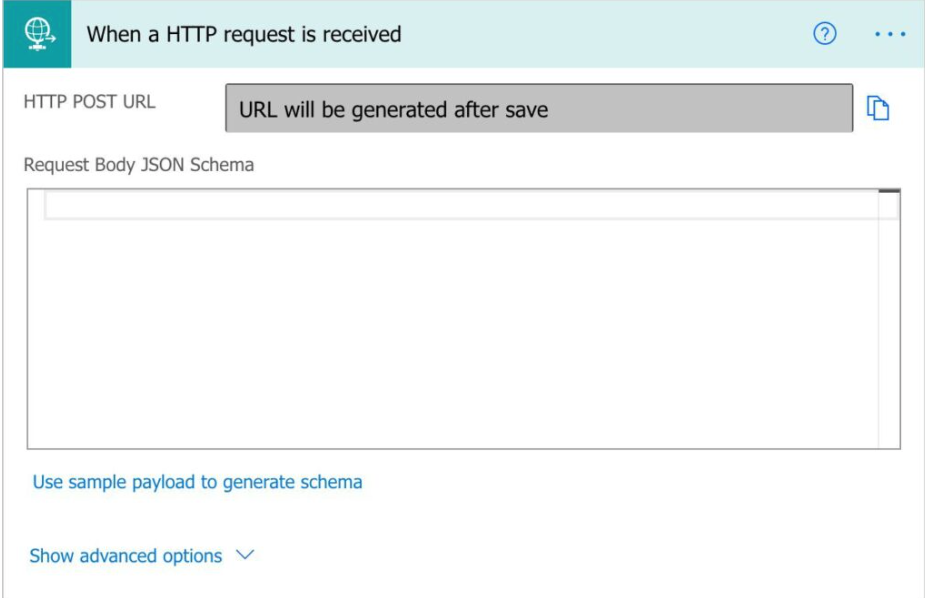 - Create a Power Automate Flow that uses the When a HTTP Request is received