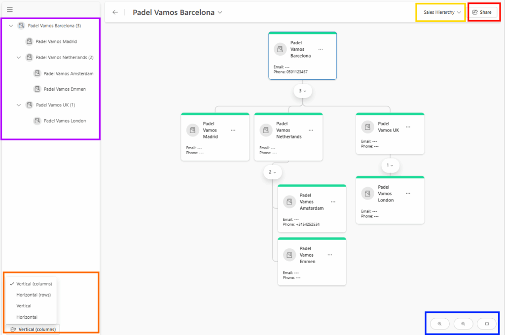 - Red section: This is where you can get the URL of your hierarchy and share it with colleagues who have access to Dynamics 365CE.