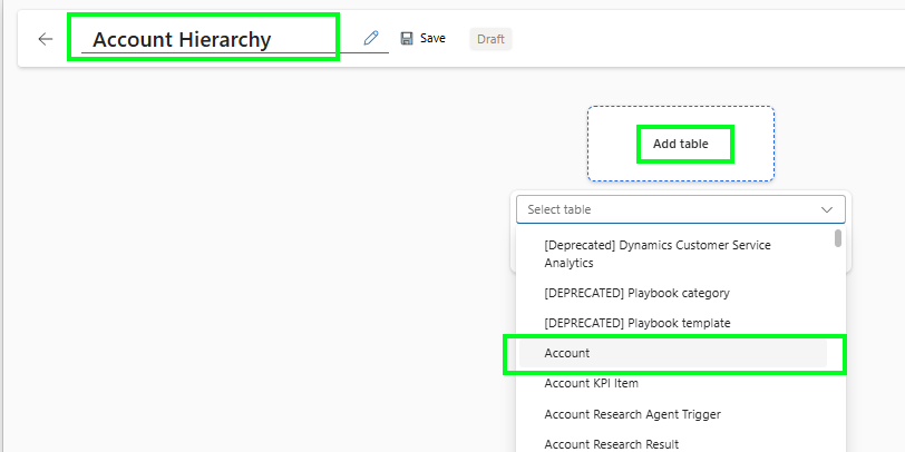 - Select Add table and find the table where you want to create a new Visual Hierarchy.