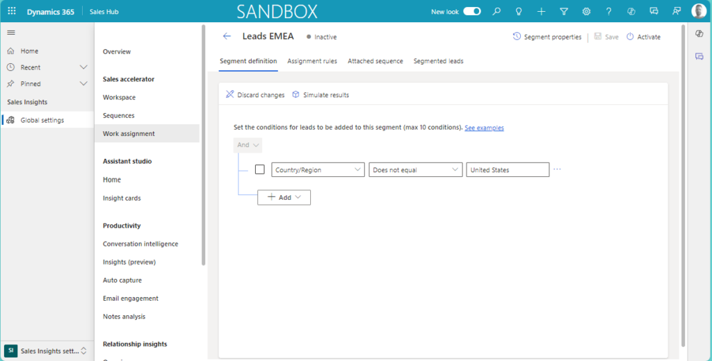 Since Team EMEA, as described in our use case, is responsible for all leads that are not coming from United Status we define the segment as shown below where we filter on Country. As mentioned before, this could be completely tailored to your needs, perhaps you want to use Lead Source, Industry, or maybe a Marketing Campaign or a combination to build your segments.