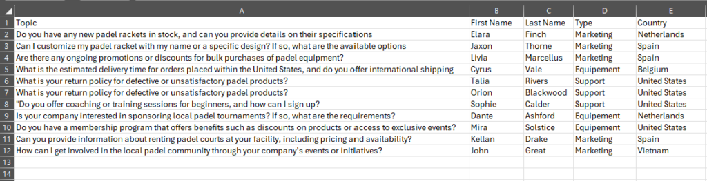 Before we can test the functionality we need to make sure the Work assignment is activated, you can do this by selecting the the segment and select: Activate. To test this functionality I have created a data file with enquiries that you can see below. This is to simulate the website with the enquiry form as mentioned in the beginning of this post. The Country column and Type column are important when it comes to work assignment to automate assignments as explained in the configuration above.